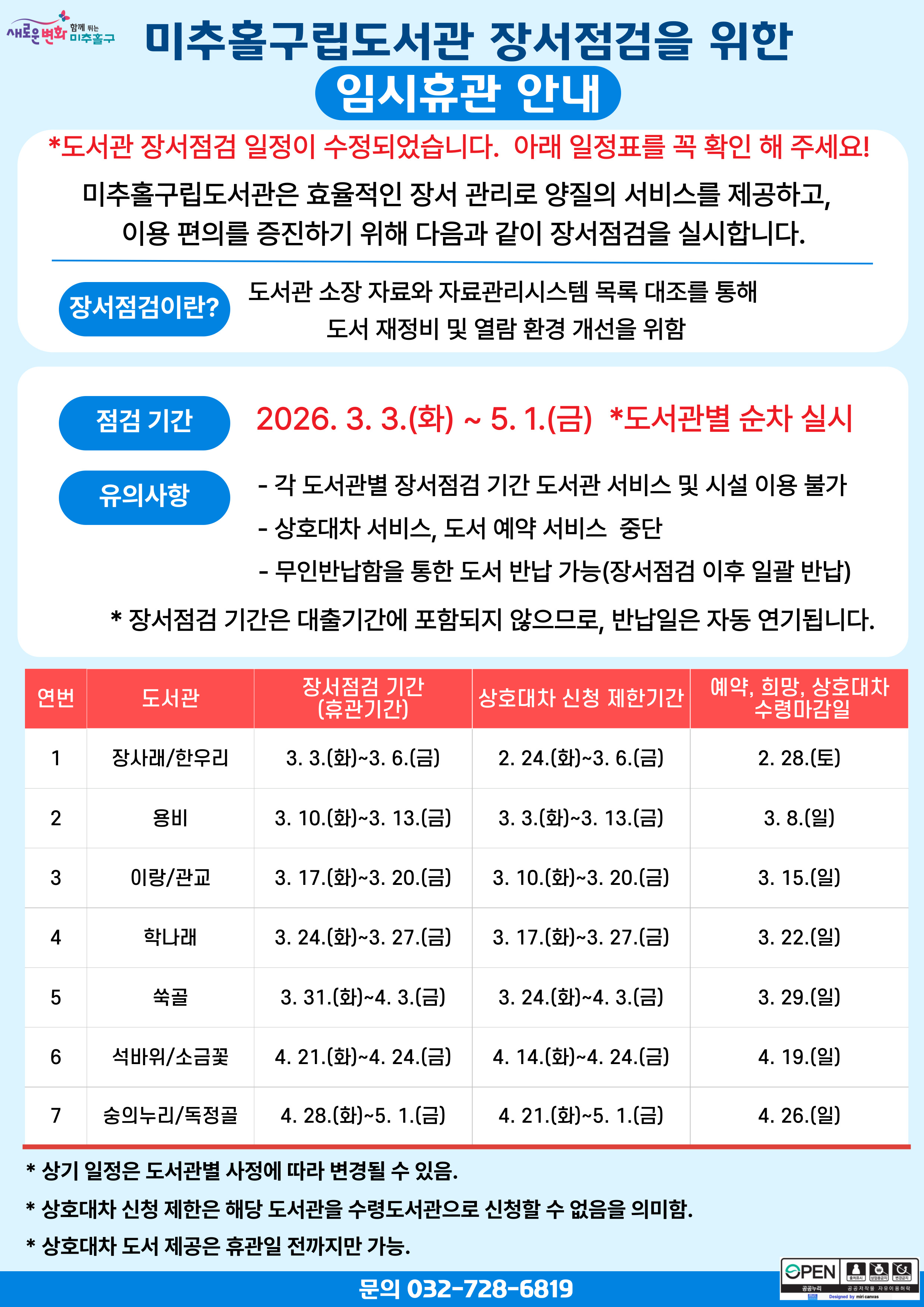 2026년 미추홀구립도서관 장서점검 실시로 인한 임시휴관 안내(장서점검 실시 도서관 순서 변경)