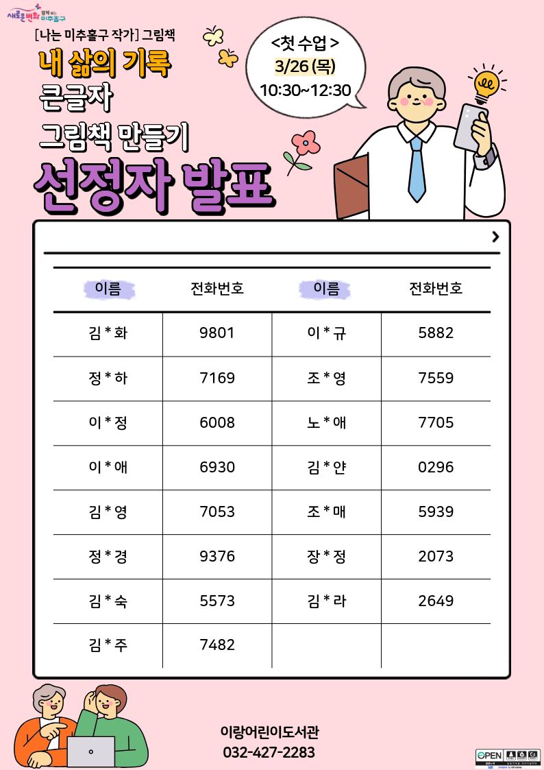 * 교육 첫 날 결석 시 수강취소, 대기자에게 수강 기회를 부여합니다. (참석이 어려우실 경우 이랑도서관으로 미리 연락부탁드립니다.)