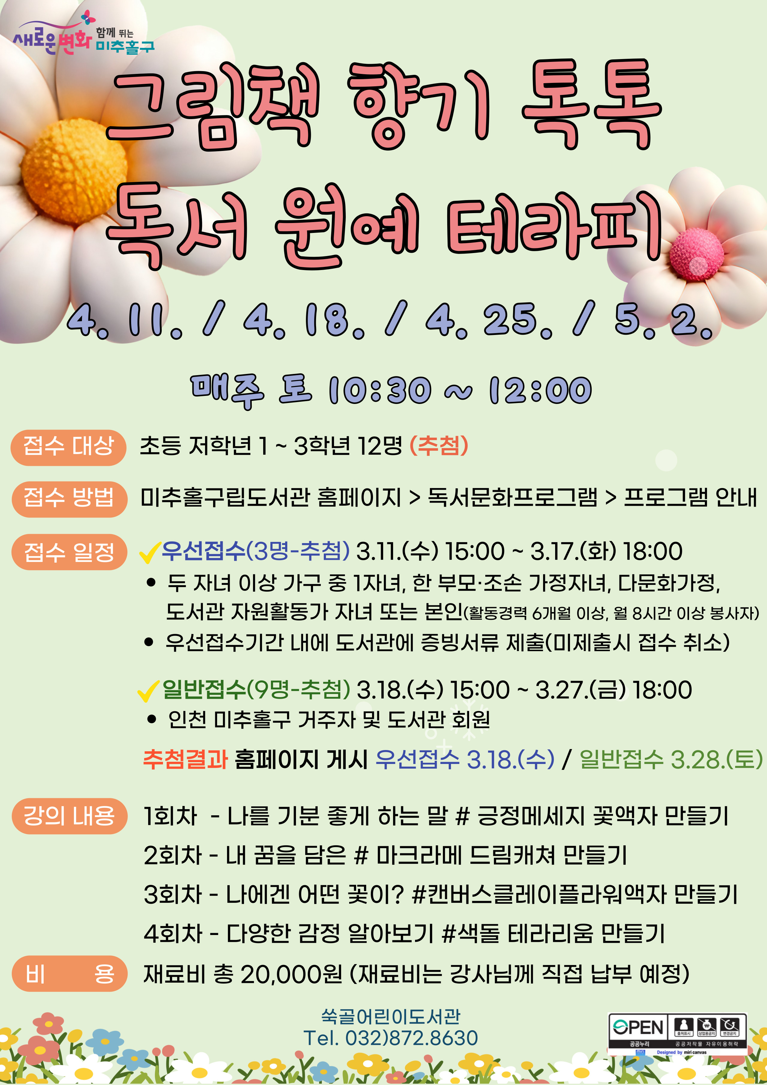 - 결과발표: 일반 추첨 발표 3. 28.(토) 미추홀구립도서관 홈페이지 게시