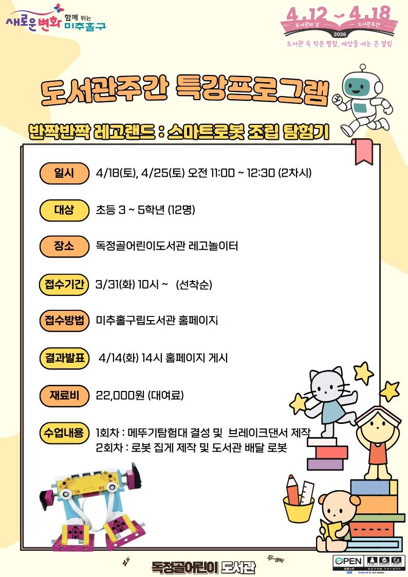 [2026 도서관주간 특강 접수 ] 창의력을 키우는 레고 코딩 프로그램 (12명 / 선착순) |